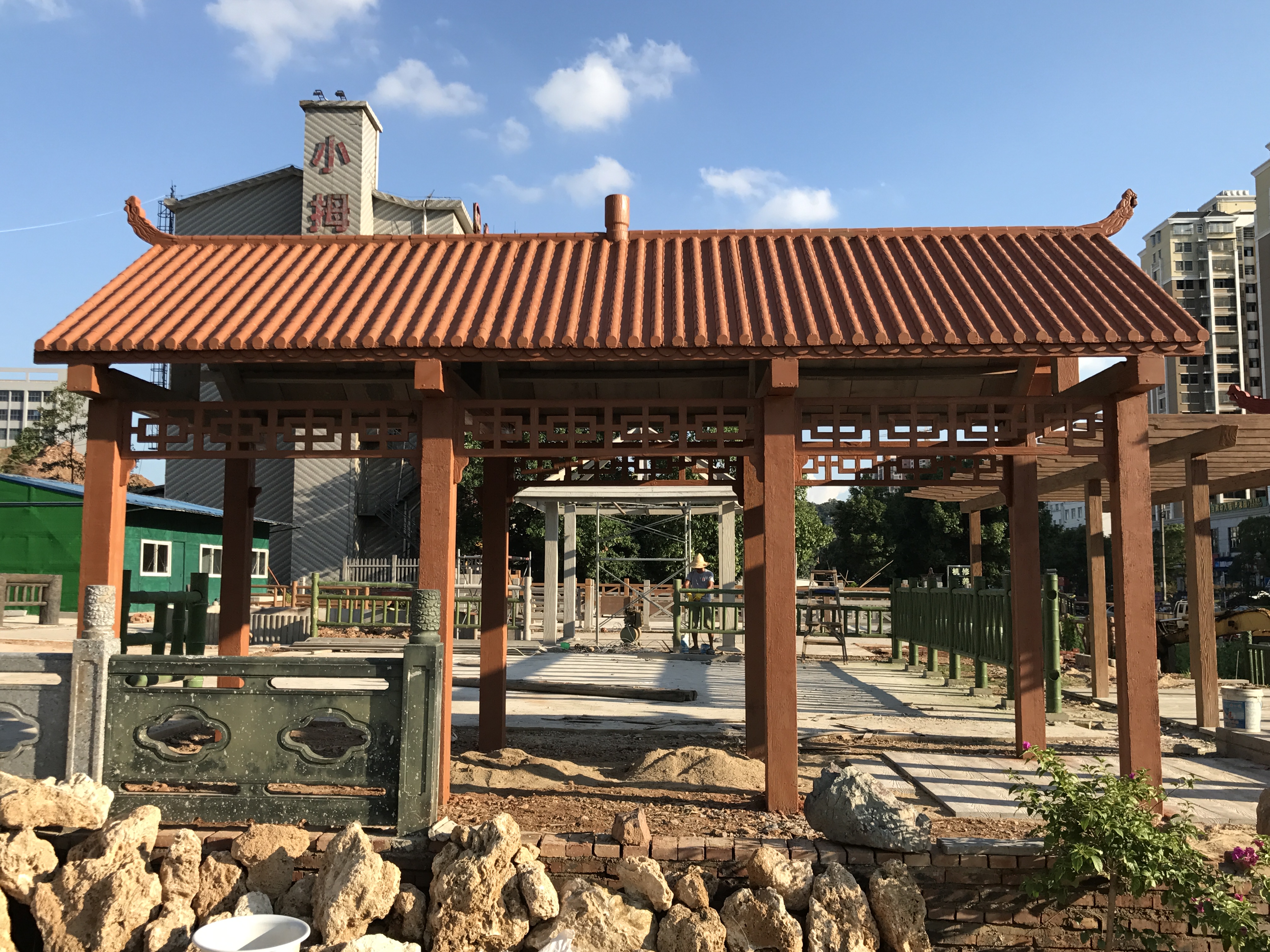 仿木长廊的构件是三合一的创新产品,由小四角亭模具和葡萄架模具共用组建而成。